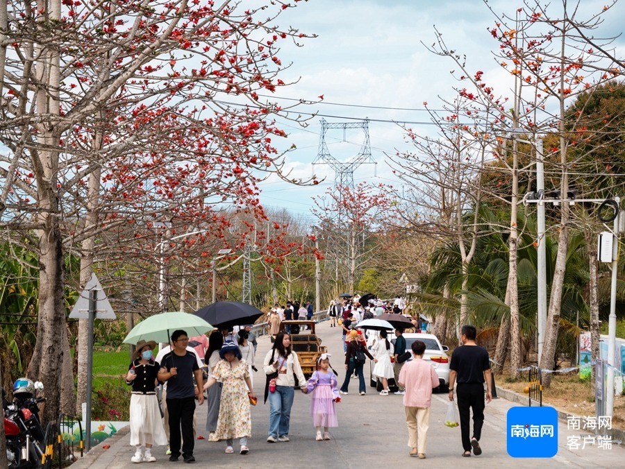昌江排岸村不雅赏木棉花的东说念主群。记者 马一鸣 摄