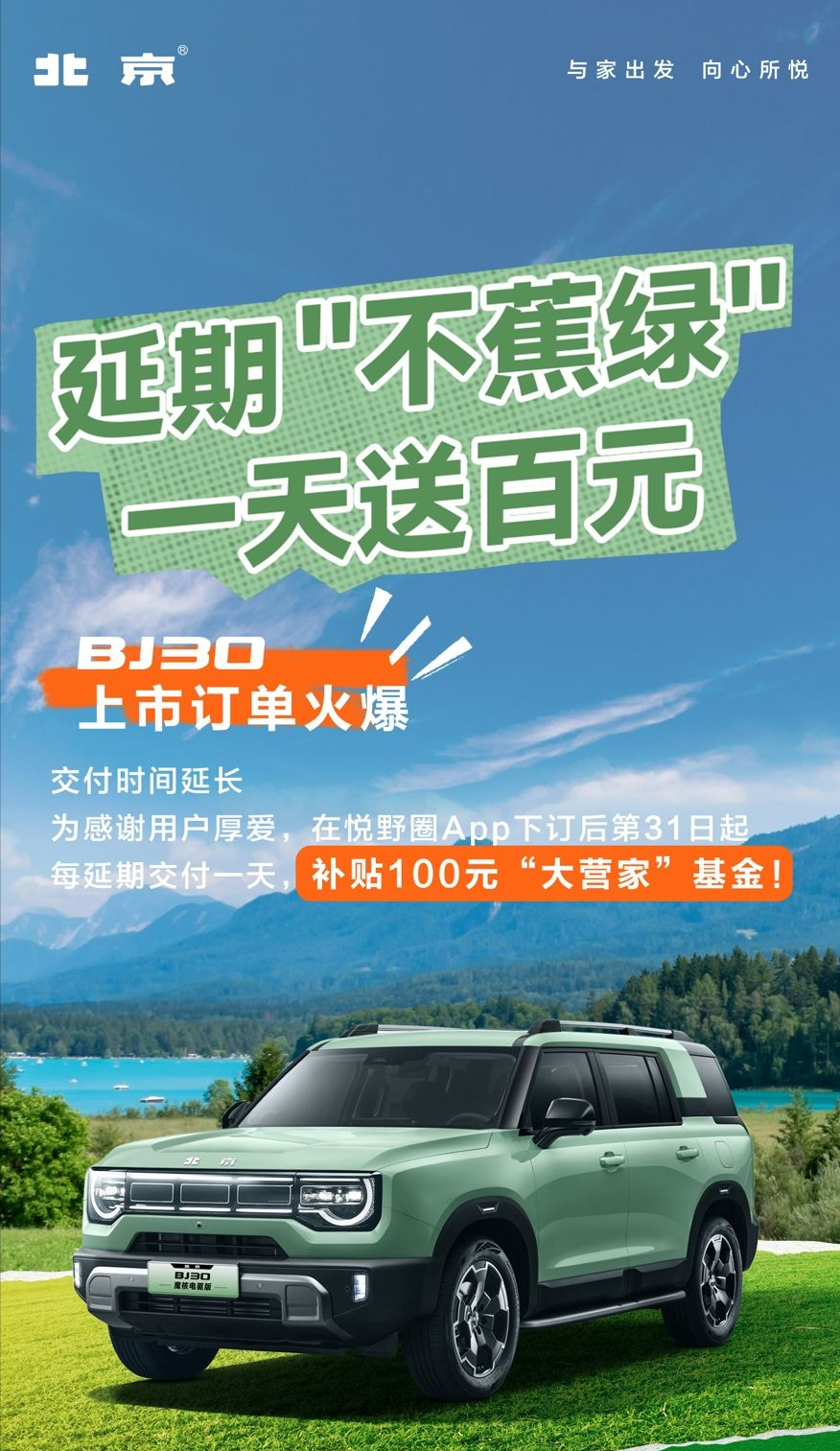 而跟着BJ30用户数目的束缚加多,如雪球般束缚堆积的用户口碑也将起到“发射”的扩大影响作用,合手续带动BJ30销量束缚攀升。近日,由于订单激增,部分用户的爱车或将脱期委用。为不亏负花消者对BJ30的横暴追捧,北京汽车推出“脱期不蕉绿,每天送百元”的抵偿职权,也即是说,凡用户在悦野车APP下订BJ30后第31日起,每脱期委用一天,将为其补贴100元“大营家”基金。同期,北京汽车也正在全力提高产能,用功舒服阛阓需求,早日将钥匙交到车主手中。