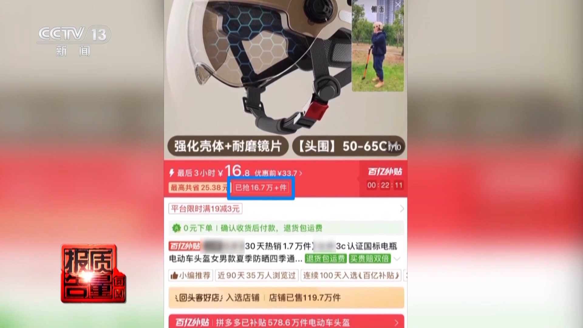 记者介意到,这些售价在二十多元的居品渊博销量不低,比如这款标价16.8元的头盔,页面流露累计销量达16.7万件。