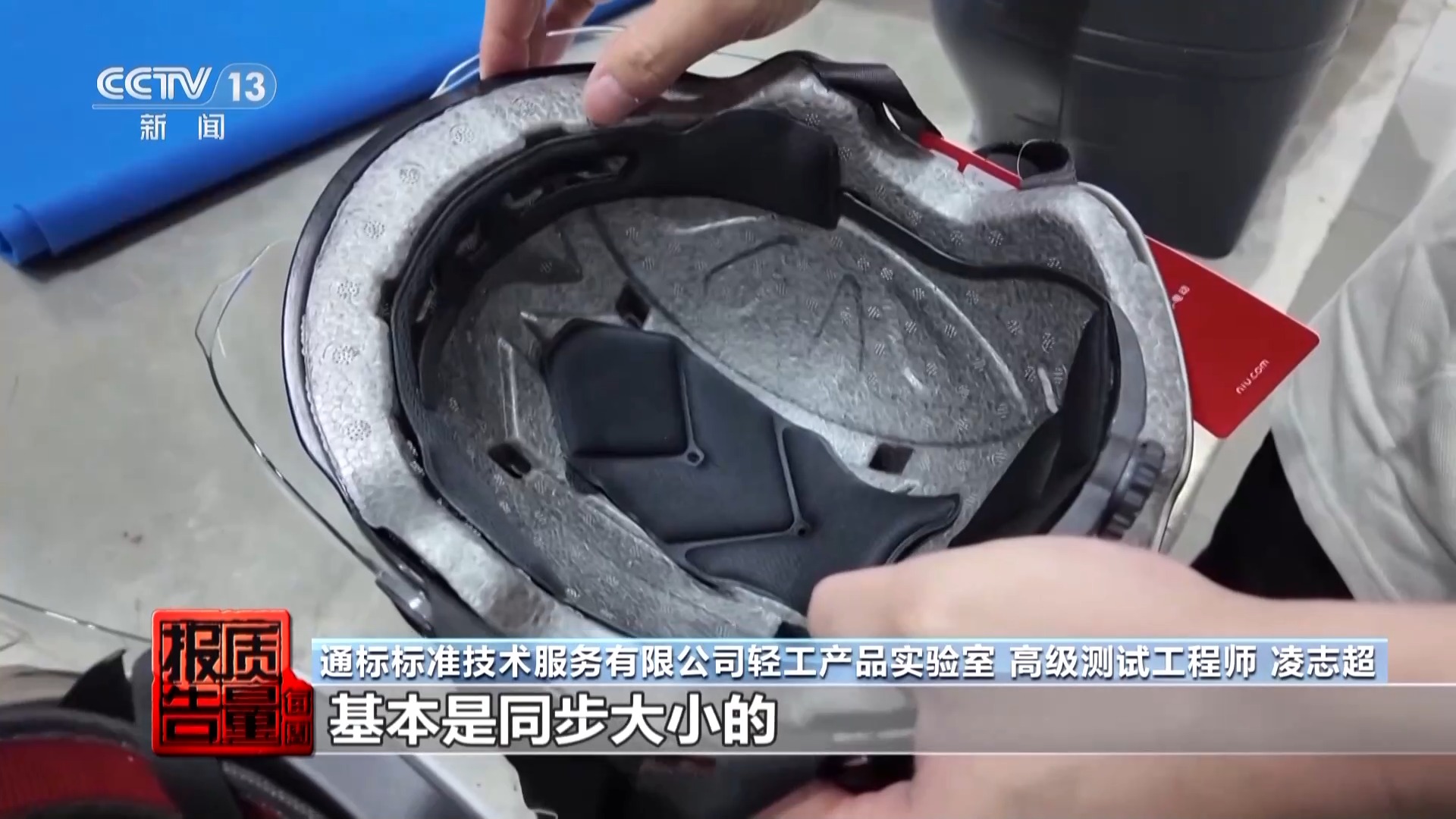通标模范期间干事有限公司轻工居品本质室高档测试工程师 凌志超:这款便是一个完全允洽模范条目的头盔,它的外壳,还有EPS的保护层、里面的内衬,像这种EPS保护层跟外壳,基本是同步大小的。像这款里面EPS继承缓冲层少了一部分。