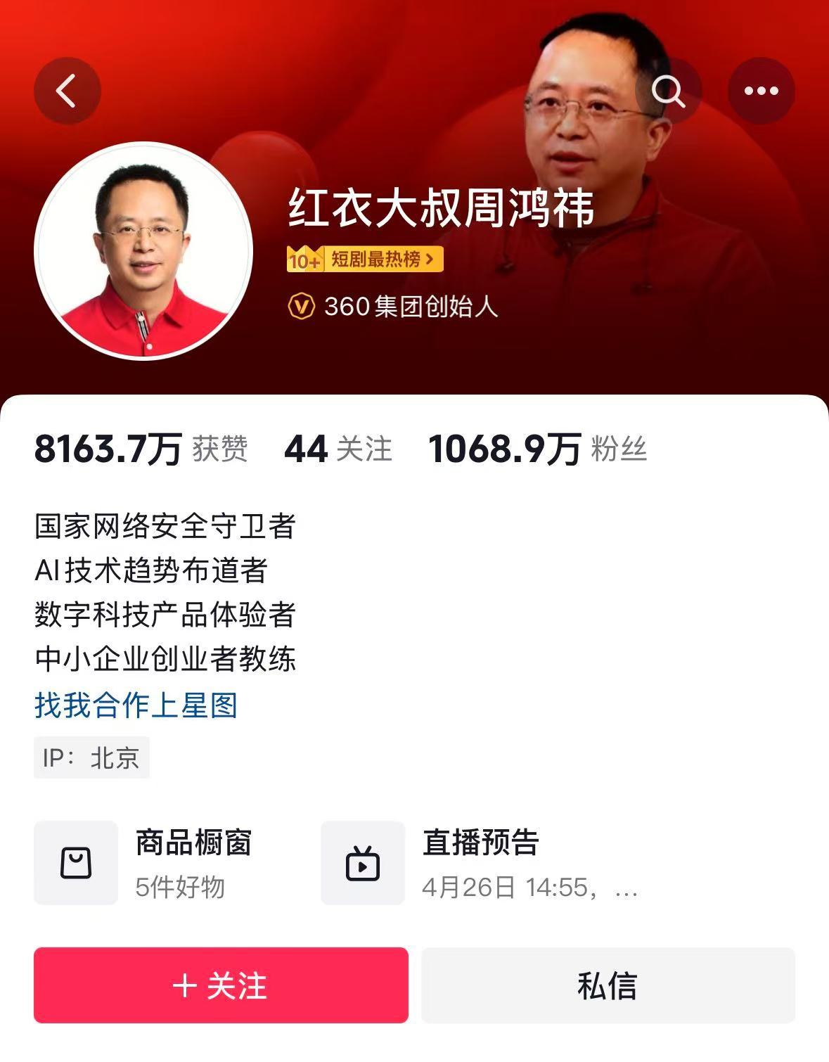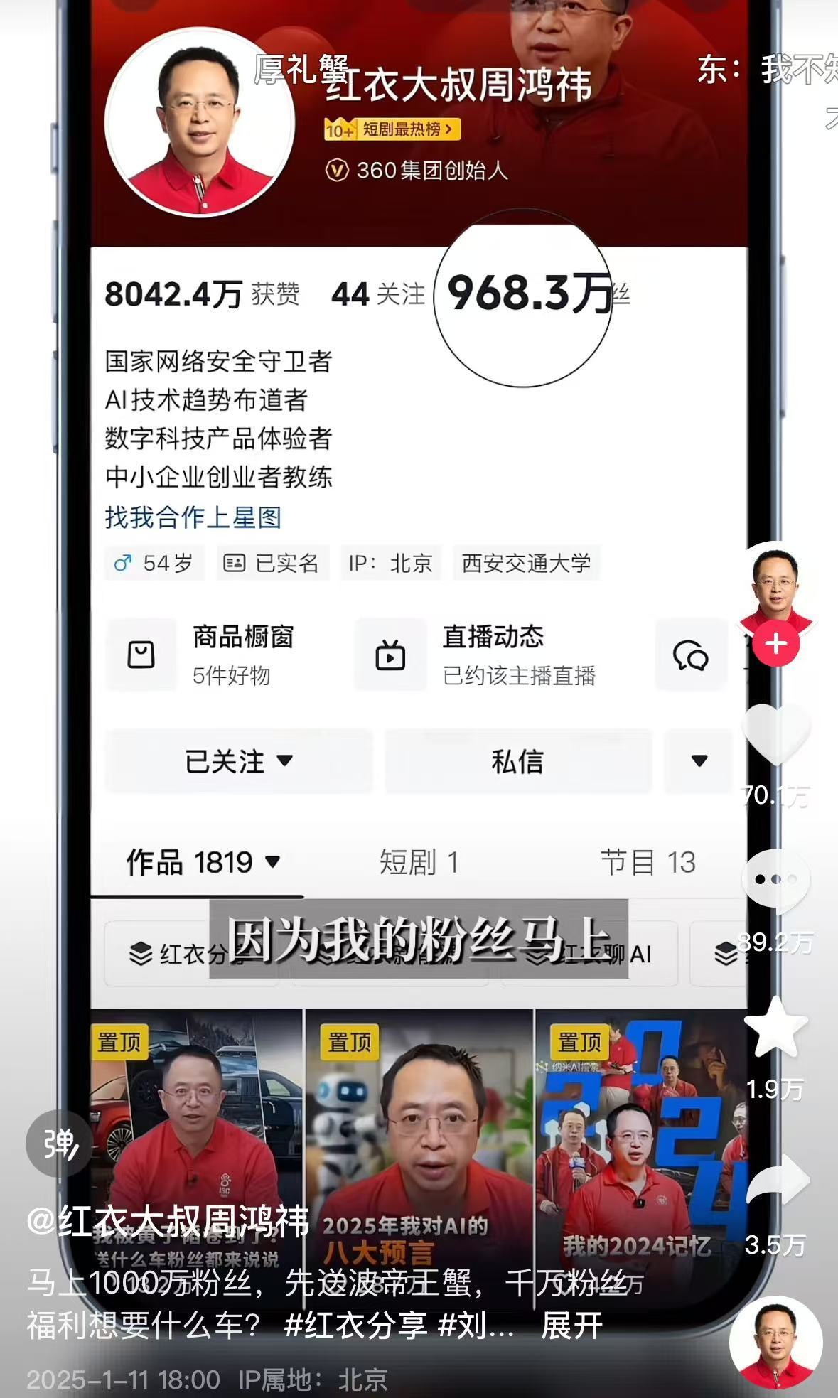 值得小心的是,在周鸿祎1月11日发布的视频中,其粉丝数为968.3万。不外,在该视频发布后,其粉丝数目大增,截止发稿,粉丝数已达到1068.9万,一日涨粉超100万。