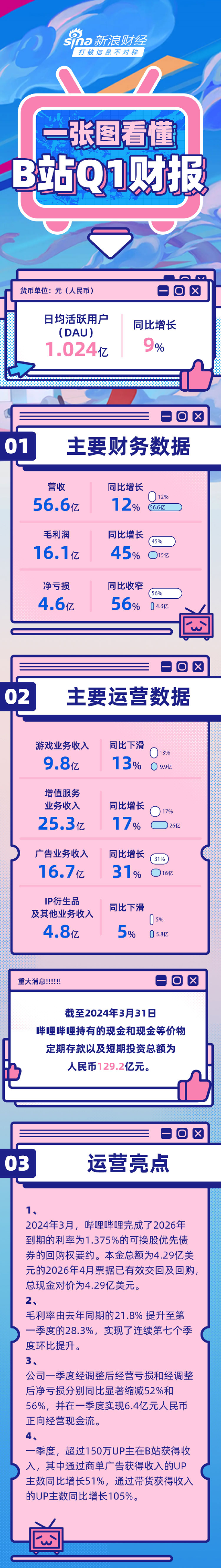 哔哩哔哩发布一季度财报:营收56.6亿元(升值管事25.3亿+告白16.7亿+出动游戏9.8亿+IP繁衍品偏激他4.8亿),同比增长56.6亿;经调净赔本4.56亿,同比收窄56%。第一季度,B站日活达1.024亿,同比增长9%,用户平均每天破耗的时辰达105分钟,再翻新高,向上150万UP主在B站获取收入。
