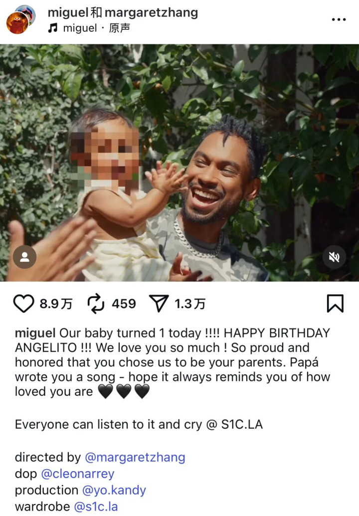 据外媒报说念,当地技术9月9日,好意思国闻名音乐东说念主米格尔·皮蒙特尔(MiguelPimentel)在Ins上发布了一条聚合帖子,为他的孩子庆祝1岁诞辰。