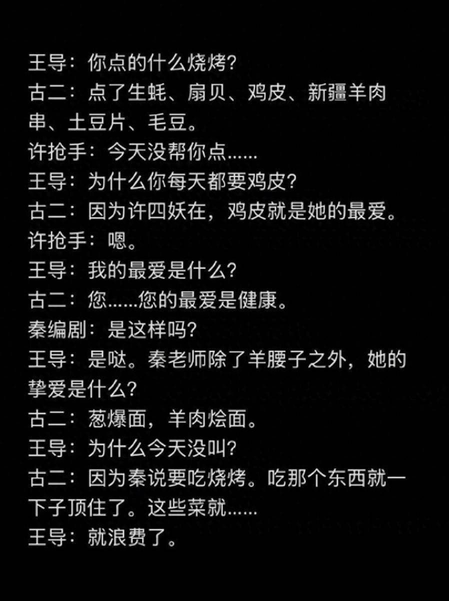 灌音骨子为古二给王家卫导演和编剧点烧烤外卖。烧烤一般都是夜宵,点的品类也不包含正餐食品,不错揣度点外卖应该是晚饭之后,比拟晚的时分、致使可能是夜深。