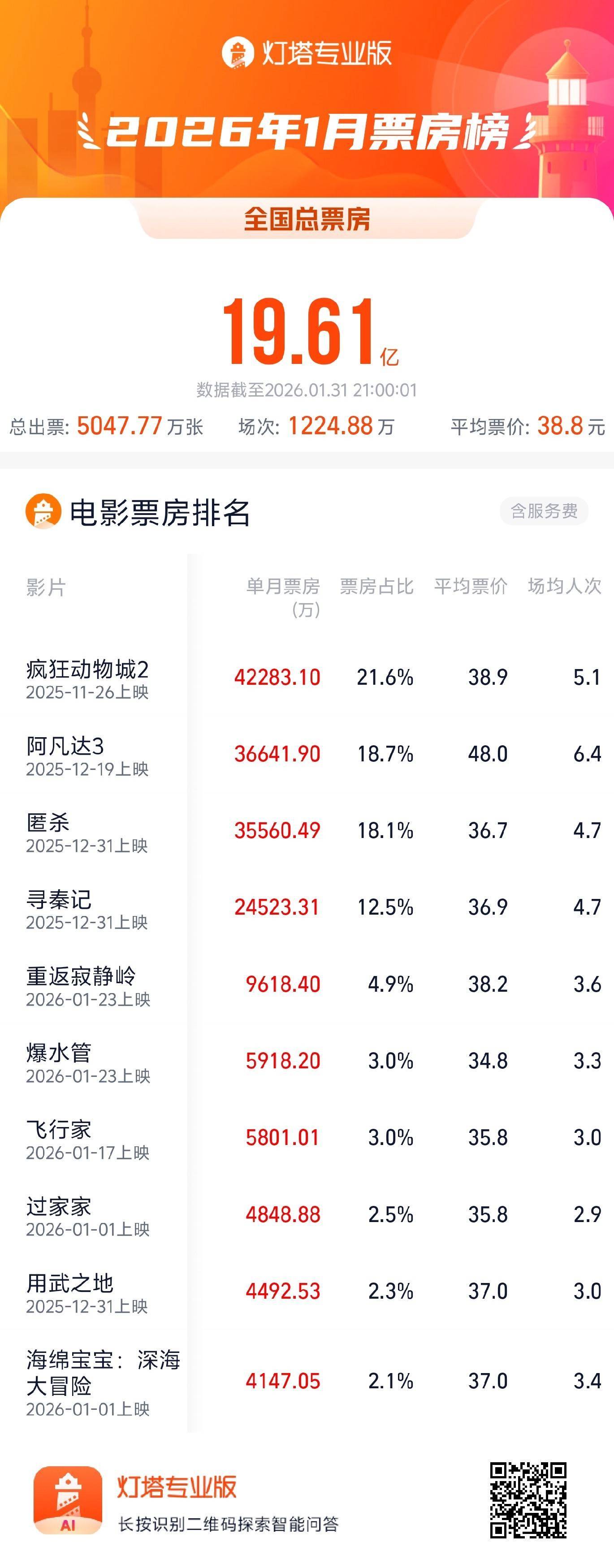 据灯塔专科版,王法1月31日21时,2026年1月总票房19.61亿,《荒诞动物城2》邻接3个月赢得月度票房冠军!
