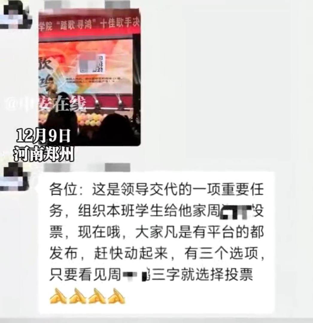 12月10日,郑州电力中等专科学校发布情况施展称:经核实,我校班子成员周某因女儿投入方位学校举行的歌手大赛投票活动,为取得高票复旧率,遂安排部分学生投票。校董事会字据规划章程,对周某进行免职科罚,并责令其向涉事师生进行谈歉。